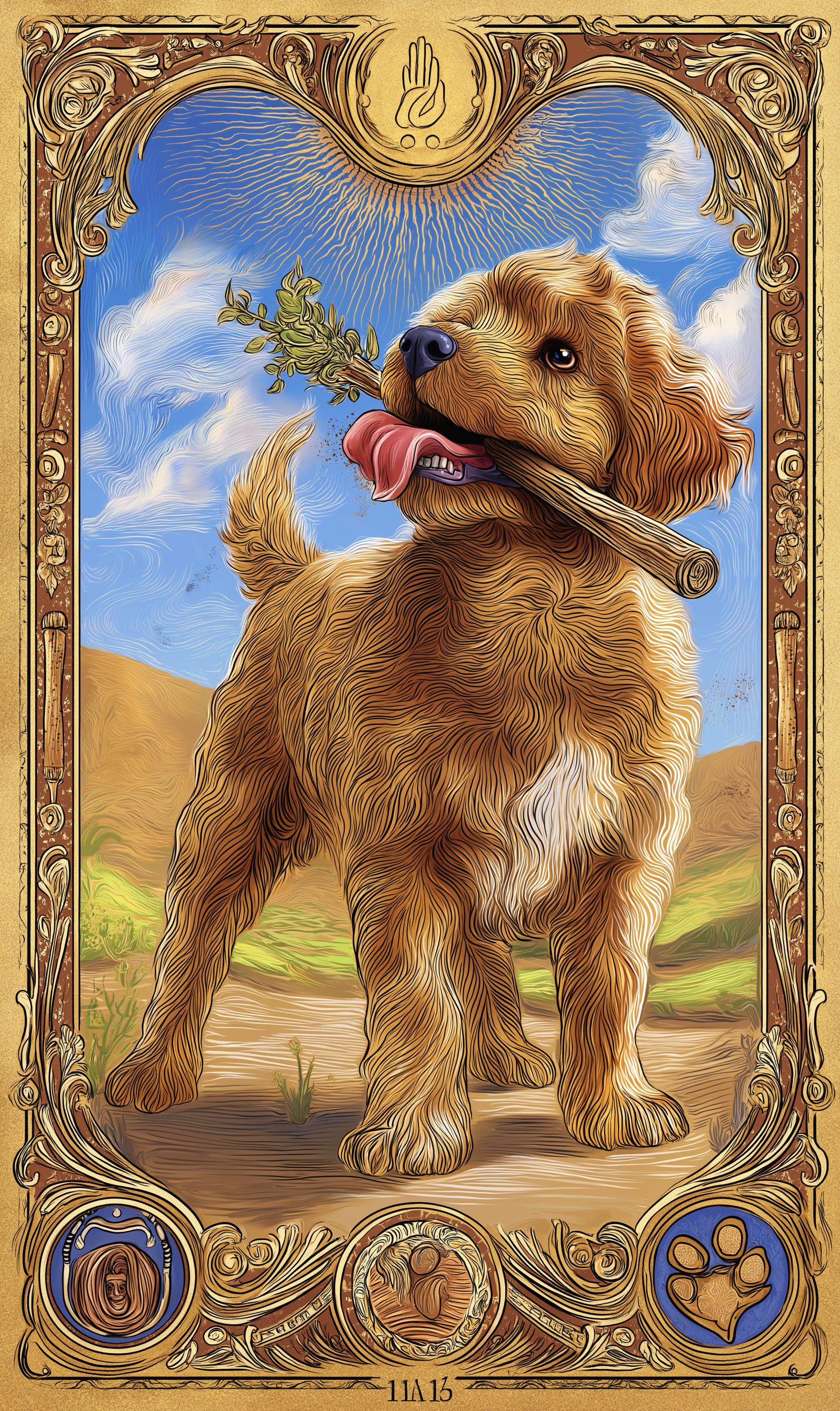 완드의 에이스 카드는 전통 타로에서 창조성, 열정, 영감, 새로운 시작을 의미합니다. 거대한 손이 하늘에서 완드를 내미는 장면은, 우리 안의 잠재된 에너지가 세상으로 뻗어 나가는 순간을 보여줍니다. 이 카드는 특히 행동과 도전, 그리고 새로운 에너지를 강조합니다. 그렇다면 강아지 타로카드에서 완드의 에이스 카드는 어떤 의미를 줄까요? 오늘은 강아지의 활발한 에너지와 새로운 활동이라는 주제로 해석해 보겠습니다.