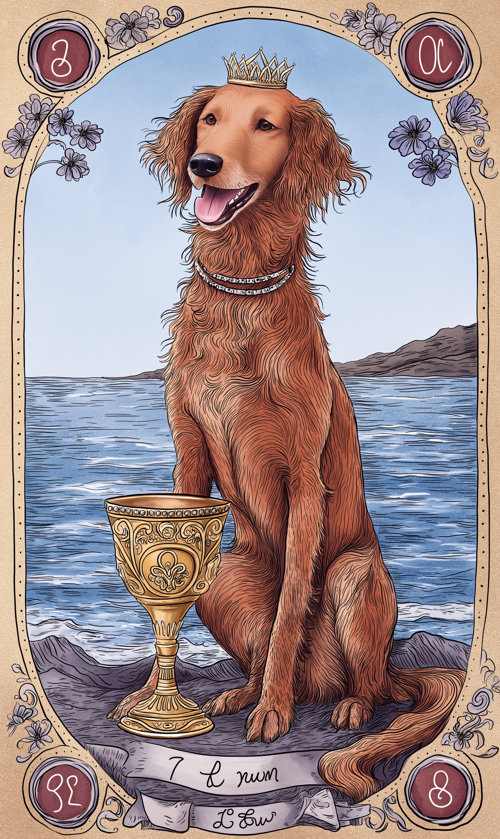**강아지 타로카드에서 Queen of Cups는 “직관적 교감과 무조건적인 사랑”**을 상징합니다.