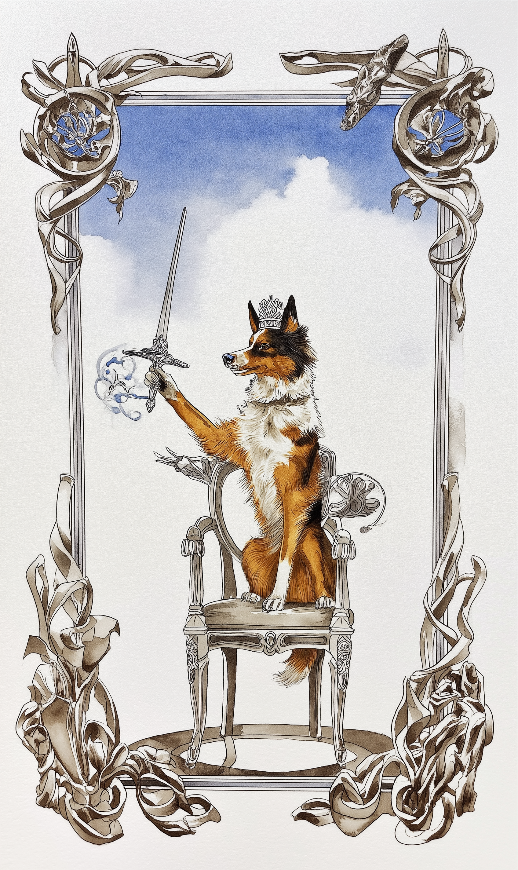 **강아지 타로카드에서 Queen of Swords는 “예리한 직관과 명확한 소통”**을 상징합니다.