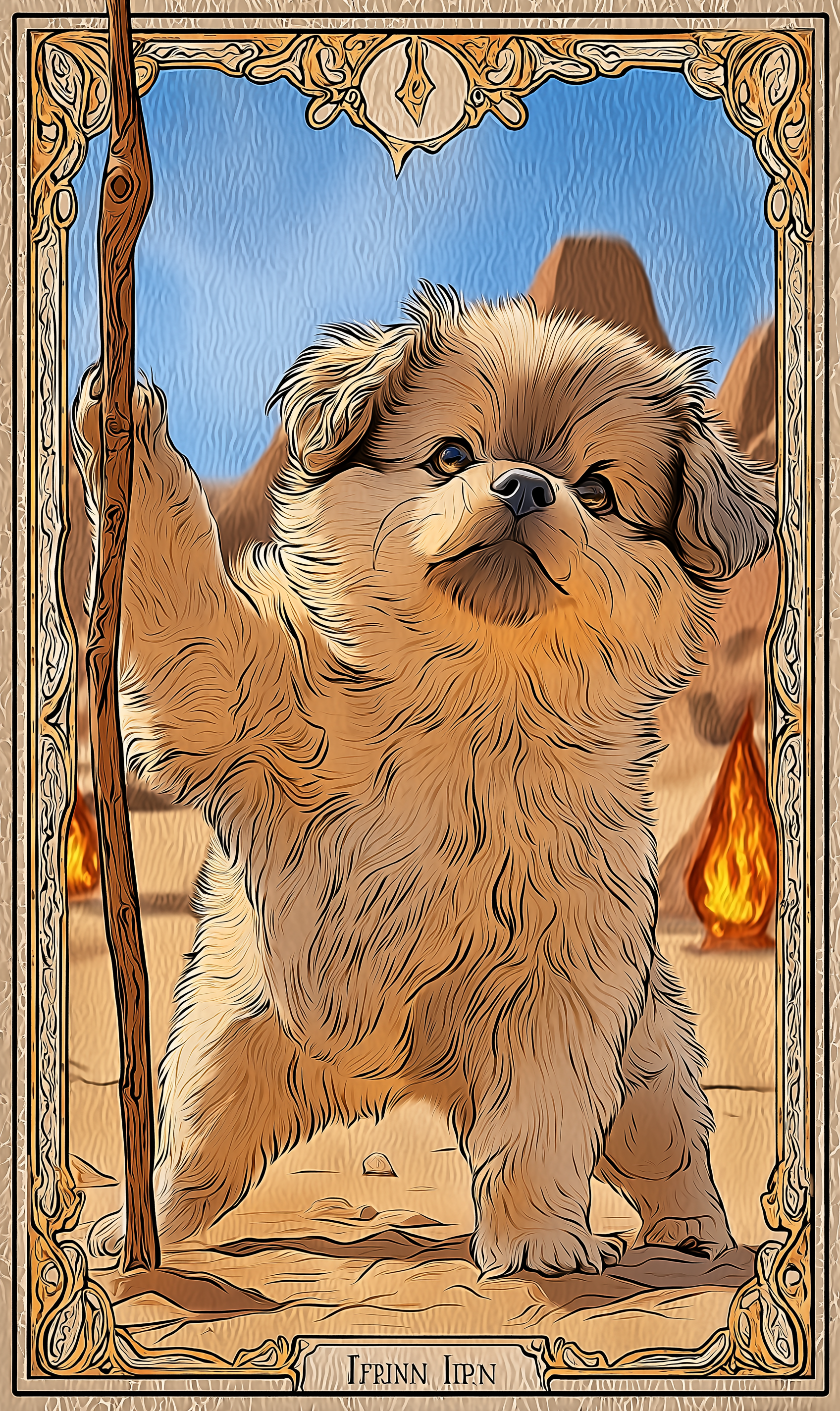 • 사막 같은 배경에 당당히 서서 완드를 들고 있는 강아지