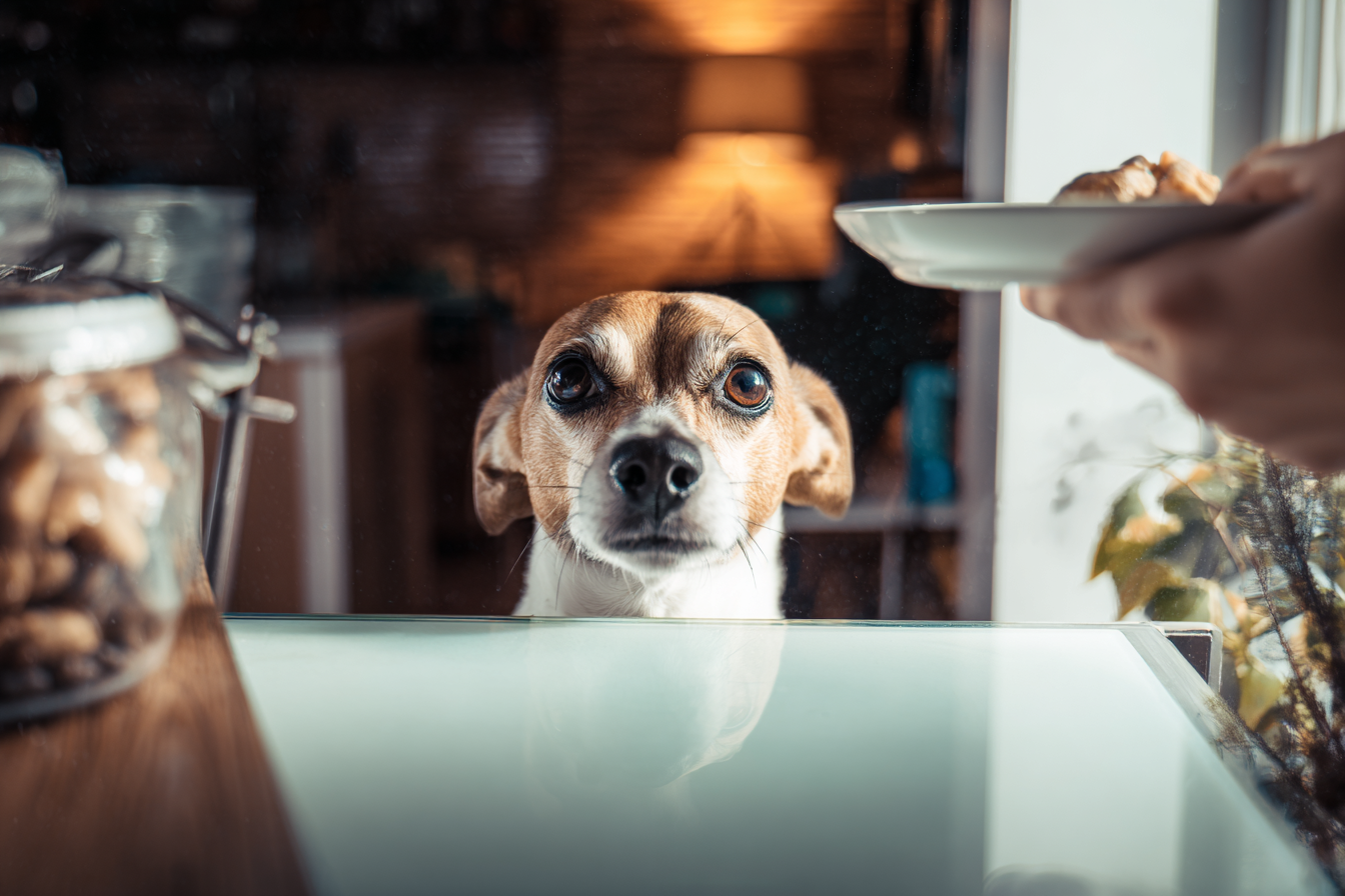 강아지가 눈망울을 반짝이며 보호자의 음식을 바라보면